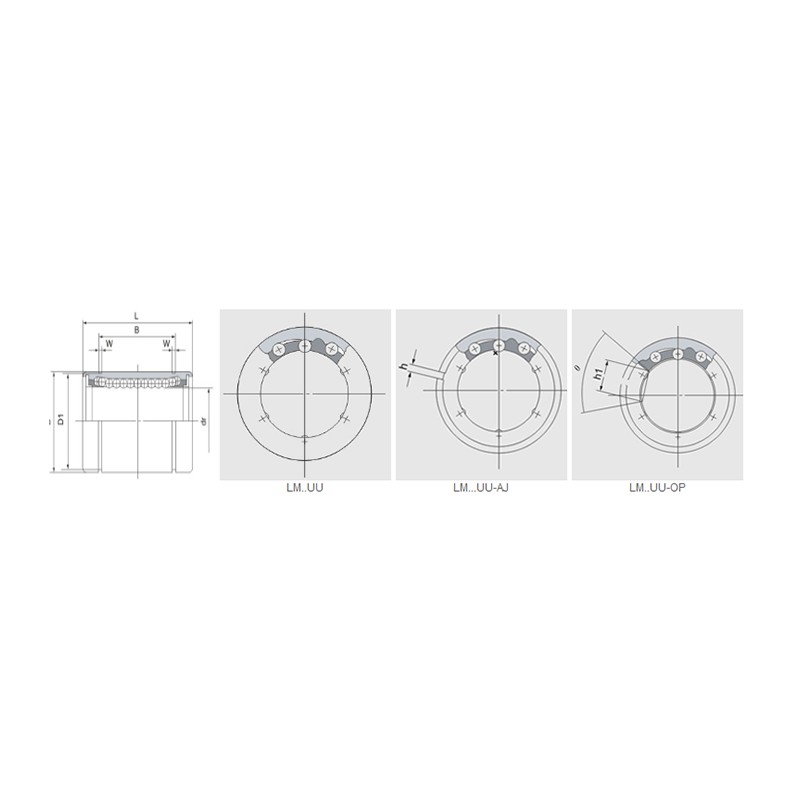| LM ... UU | Globus circuitu | Pondus (kg) | LM ... UU, AJ | Globus circuitu | Pondus | LM ... uu-op | Globus circuitu | Pondus (kg) | mm | mm | Tolerantia | Tolerantia | D mm | Tolerantia (μm) | L mm | Tolerantia (μm) | B mm | Tolerantia (μm) | W (mm) | D1 (mm) | h (mm) | H1 (mm) | θ θ | Praecisione | Altum | Dynamic | Stabilis | |